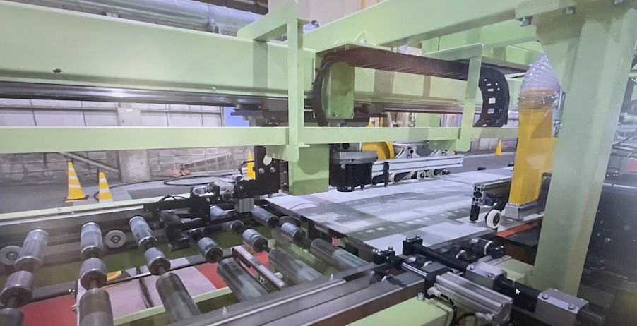 ハウスメーカー向けの台所用耐火パネルのカットライン装置。 ローラで移動してきたパネルをカットして、次のラインに送る。 1台のカットライン装置の7軸でECSを使用頂く。