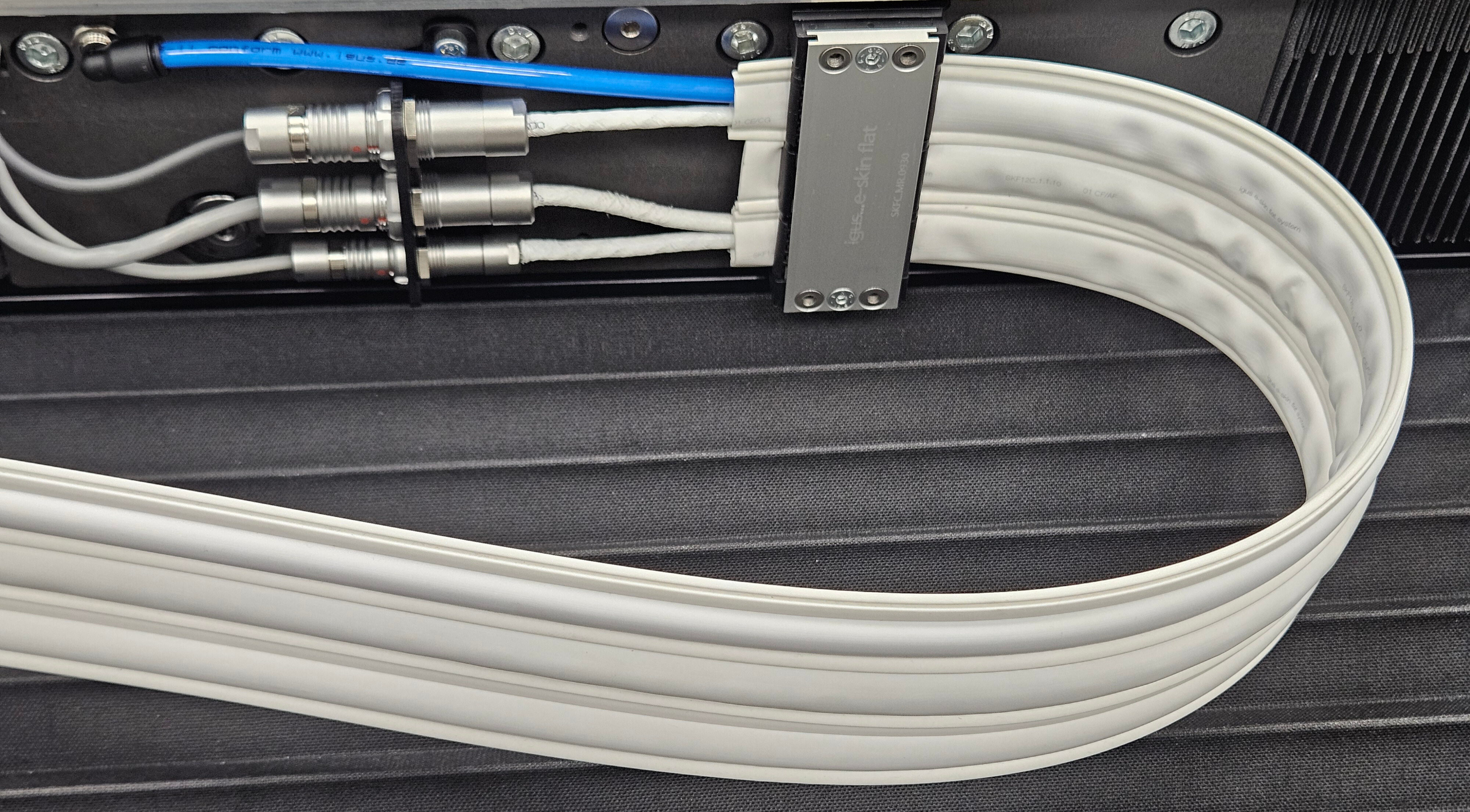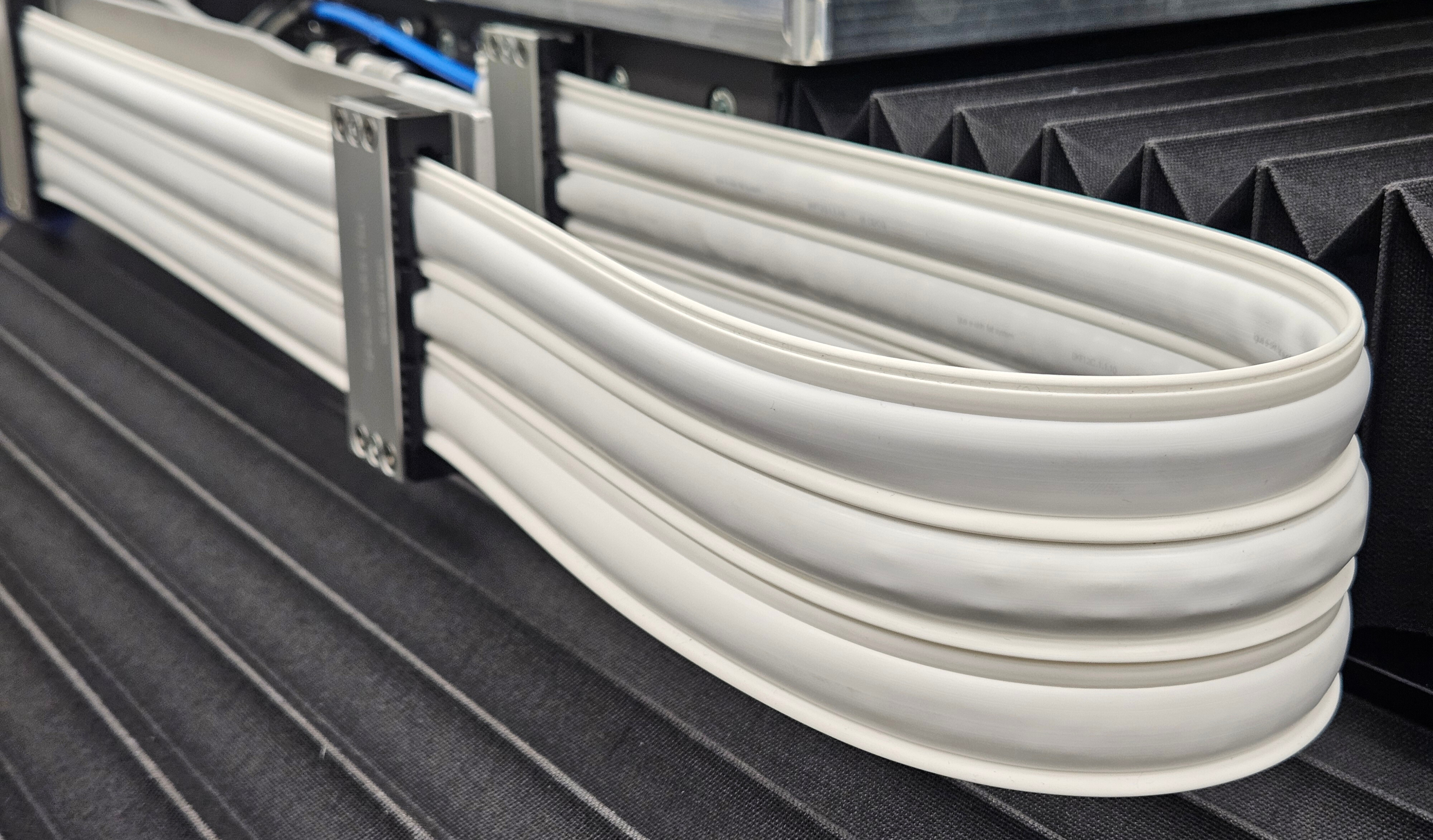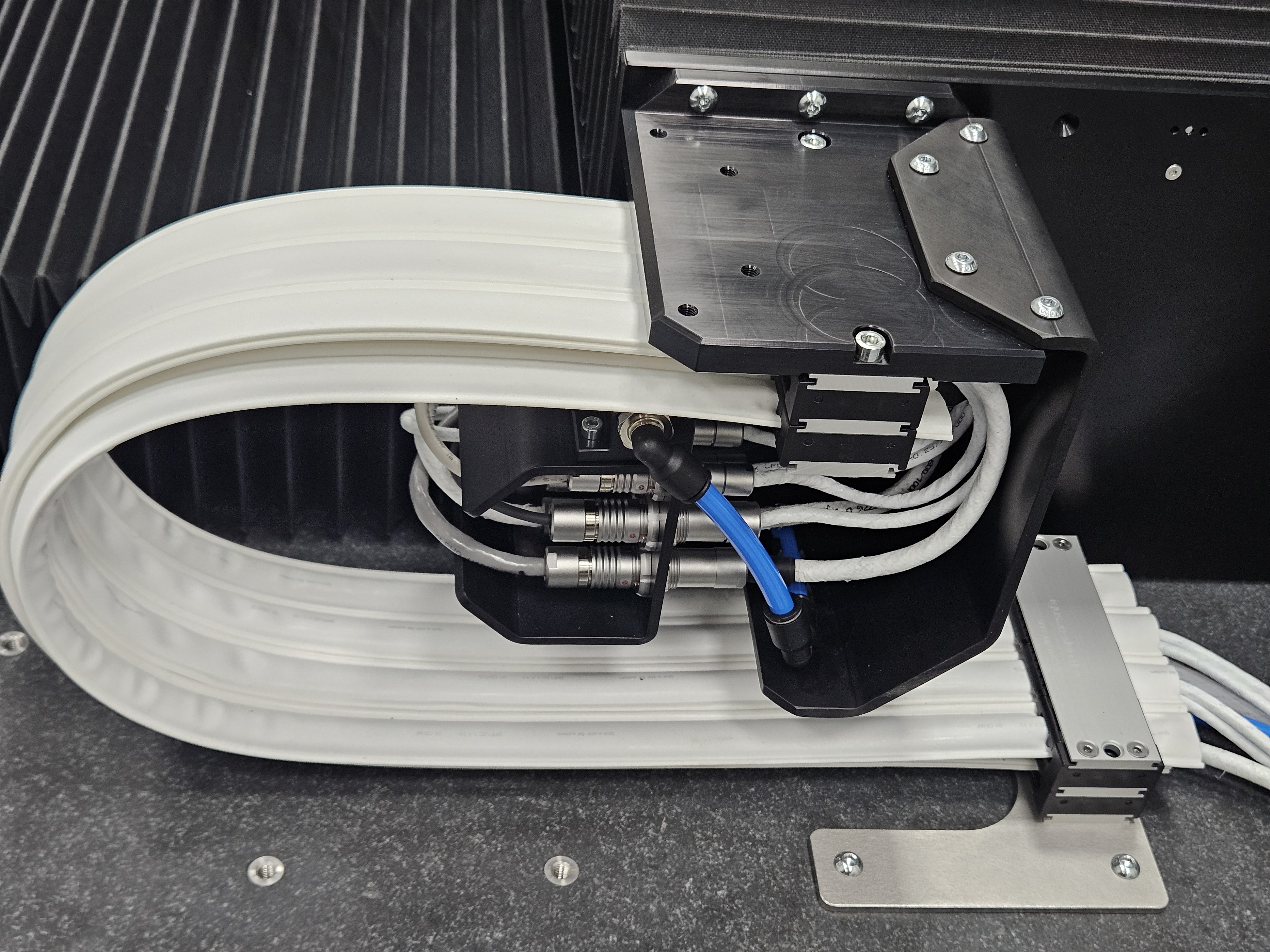 Der Endkunde verlangte einen sehr strengen ISO-Klasse-1-Standard für die Betriebsumgebung mit einer Genauigkeit im Submikrometerbereich für Positionierung und Bewegung. Angesichts dieser Anforderungen sind Standard-Kabelketten für eine derart extreme Präzision ungeeignet: Die Reibung zwischen den Gliedern erzeugt Mikrovibrationen, die zu messbaren Positionierungsfehlern in Luftlagersystemen führen. Darüber hinaus sind herkömmliche Ketten eine Quelle für Partikelverunreinigungen, was in sterilen Umgebungen inakzeptabel ist. Schließlich führt die Komplexität der Verlegung von Strom-, Hochfrequenzkabeln und pneumatischen Luftschläuchen oft zu „überladenen” Konstruktionen, die sowohl die Leistung als auch die „attraktive” High-End-Ästhetik beeinträchtigen, die unsere globalen Kunden erwarten. Um diese Einschränkungen zu überwinden und den Stand der Technik neu zu definieren, hat Mager die innovative igus® e-skin flat integriert. Diese Lösung ermöglicht die „nahtlose” und verdeckte Verlegung aller erforderlichen Kabel und Druckluftleitungen unter Beibehaltung eines schlanken und professionellen Designs. Da die e-skin flat eine einteilige, bandartige Struktur ohne Stifte oder Verbindungsstellen ist, arbeitet sie absolut geräuschlos. Dadurch wird die Übertragung von Vibrationen auf den Luftlagertisch verhindert, was eine beispiellose Genauigkeit in der Messtechnik und Mikrobearbeitung ermöglicht. Das Hochleistungspolymer gewährleistet, dass keine Partikel abgegeben werden, und erfüllt damit die strengsten Reinraumanforderungen.