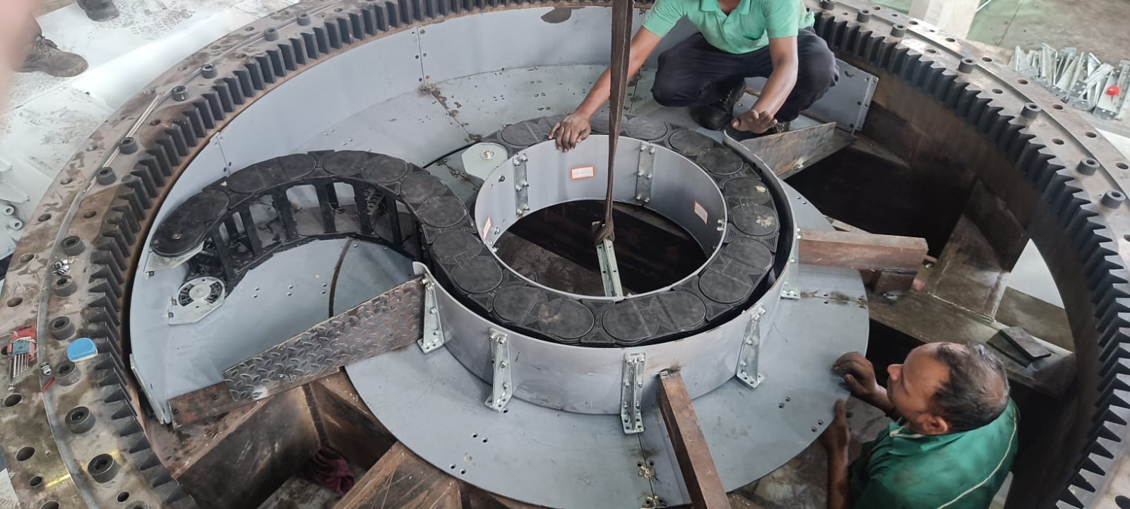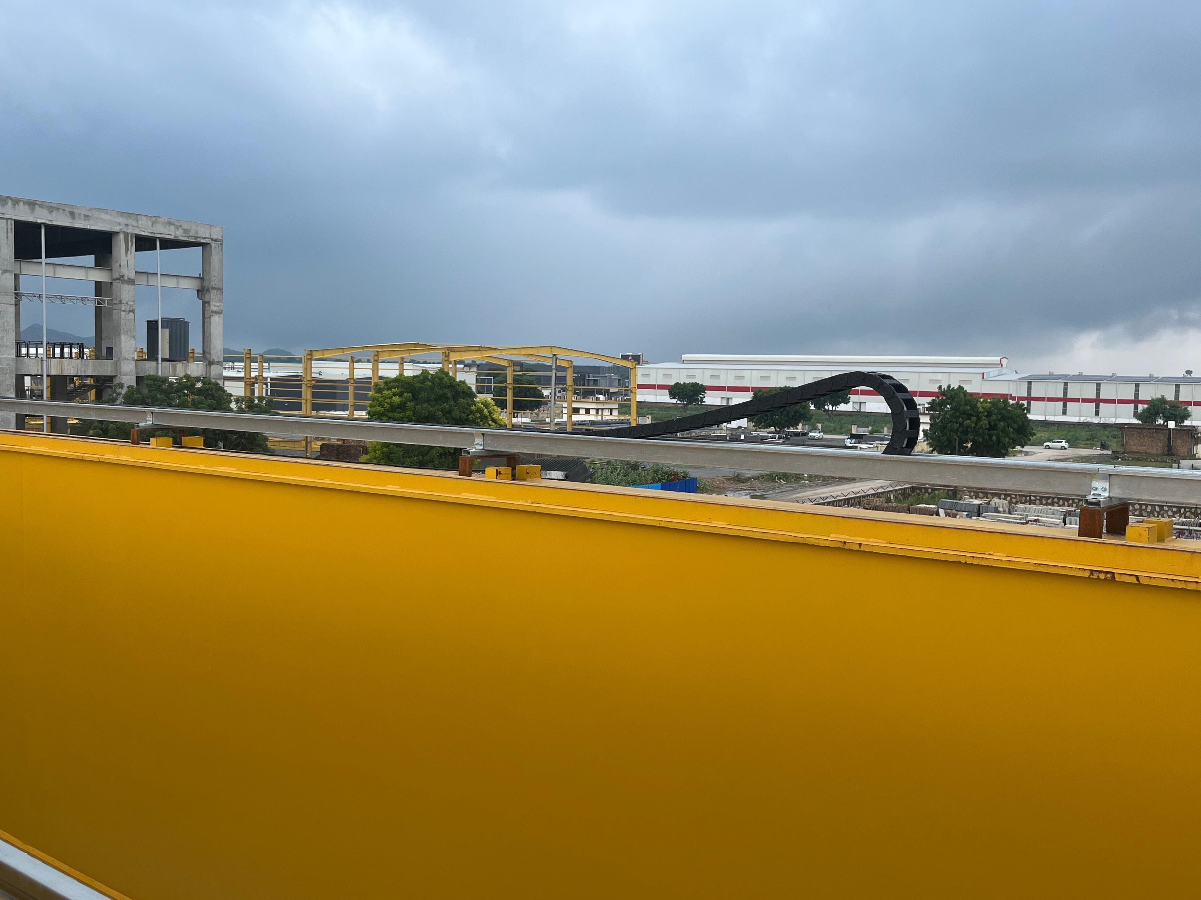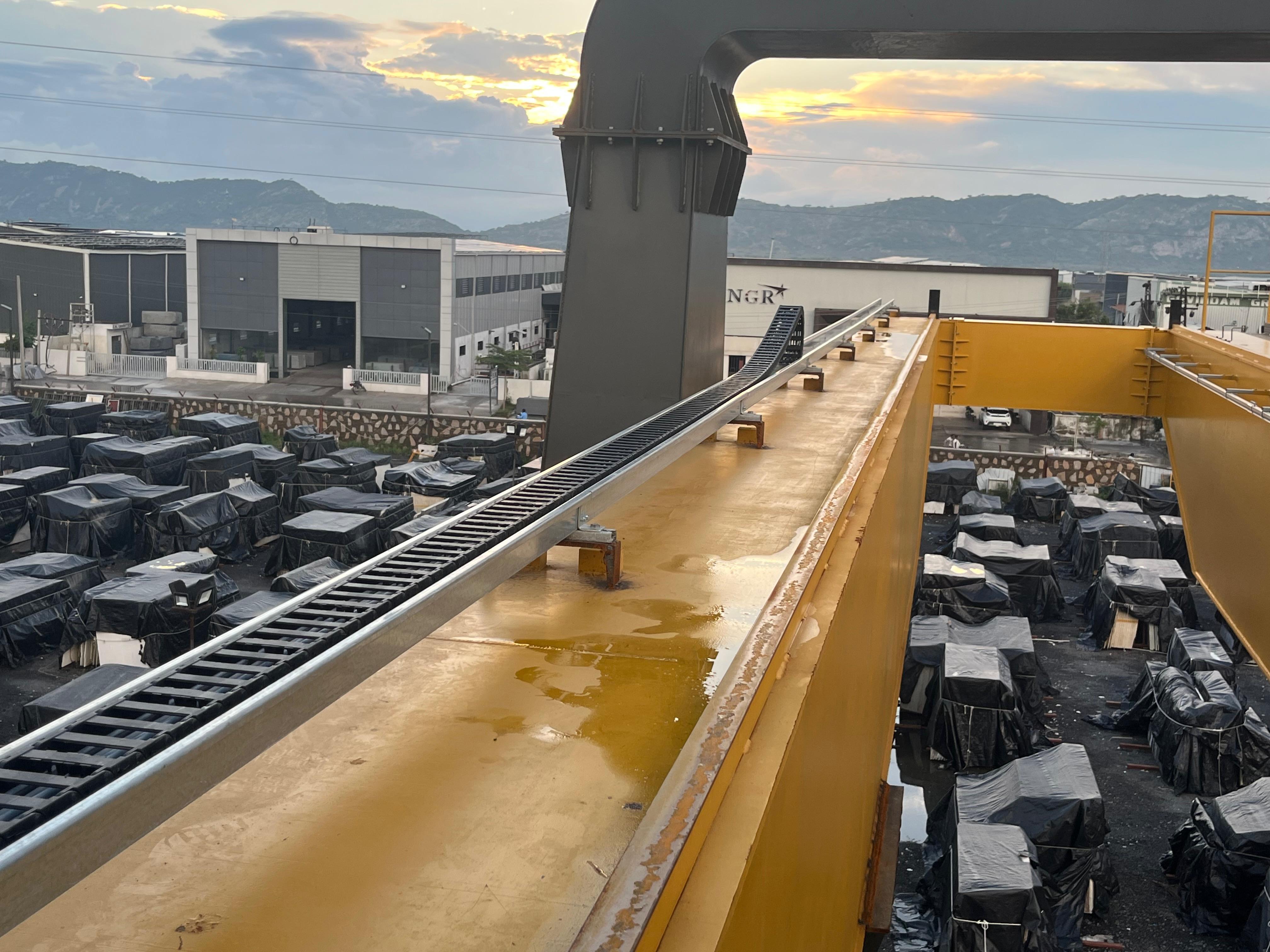 Umgebungsbedingungen sind 1) Außenbereich – Temperatur 2 Grad – 50 Grad Celsius 2) Wind, Sonneneinstrahlung (UV), Regen 3) Geschwindigkeit: 0,5 Meter pro Sekunde, Fahrstrecke 38 Meter Früher verwendete Shri Bhagwati Machines Private Ltd ein herkömmliches Festoon-System Herausforderungen, denen wir gegenüberstanden 1) Die Installationszeit ist länger, da wir zuerst die Schiene, dann die Laufkatzen und schließlich die Kabel installieren müssen 2) Es ist nicht zuverlässig, da es an der Innenseite des Hebeseils installiert ist, das sich manchmal in den Festoon-Laufkatzen verheddert und während des Betriebs leicht reißt. 3) Die Wartung dieses Systems ist kritisch, da keine Plattform für Wartungsarbeiten zur Verfügung steht. 4) Da der Portalkran im Freien installiert ist, neigt er während der Regenzeit zu Rostbildung, was zu einer Blockierung der Laufkatzen führt. 5) Außerdem ist das System in einer Höhe von 15 Metern über dem Boden installiert, sodass auch Sicherheitsbedenken bestehen.