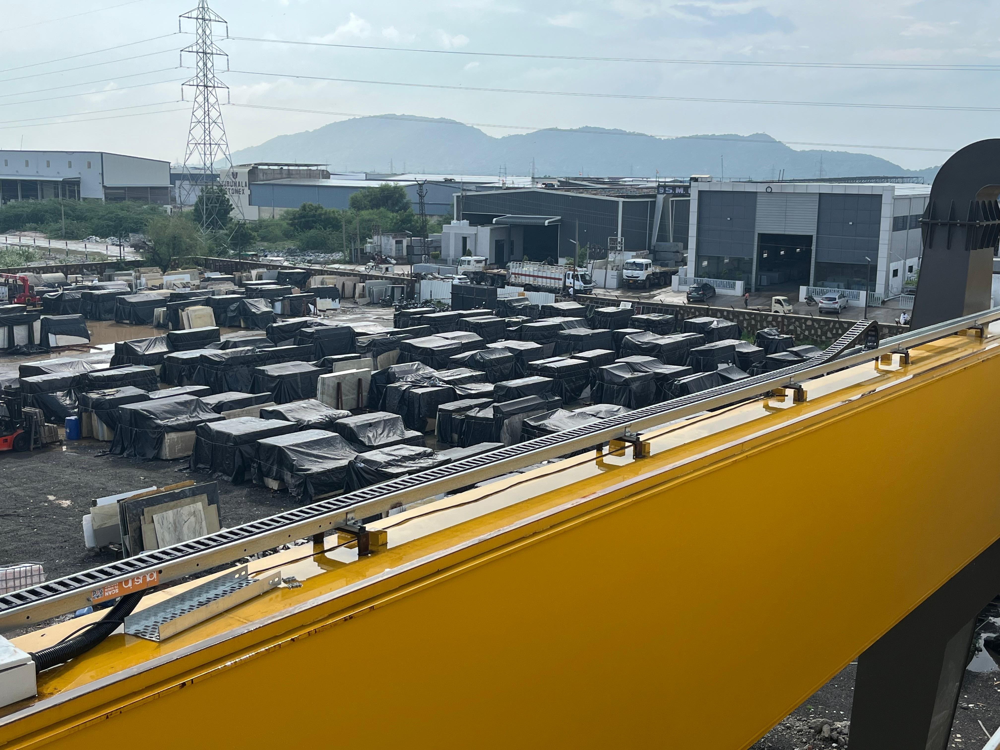 Es hebt rohe Marmor- und Granitsteinblöcke mit einem Gewicht von etwa 30 bis 40 Tonnen in der Granit- und Marmorverarbeitungsanlage. Es ist im Außenbereich unter rauen Umgebungsbedingungen installiert, um Regen, Staub und Sonnenlicht standzuhalten. Nach dem Anheben werden die Steinblöcke auf Transportwagen gelegt, um sie zum Schneiden in Platten weiterzubefördern.