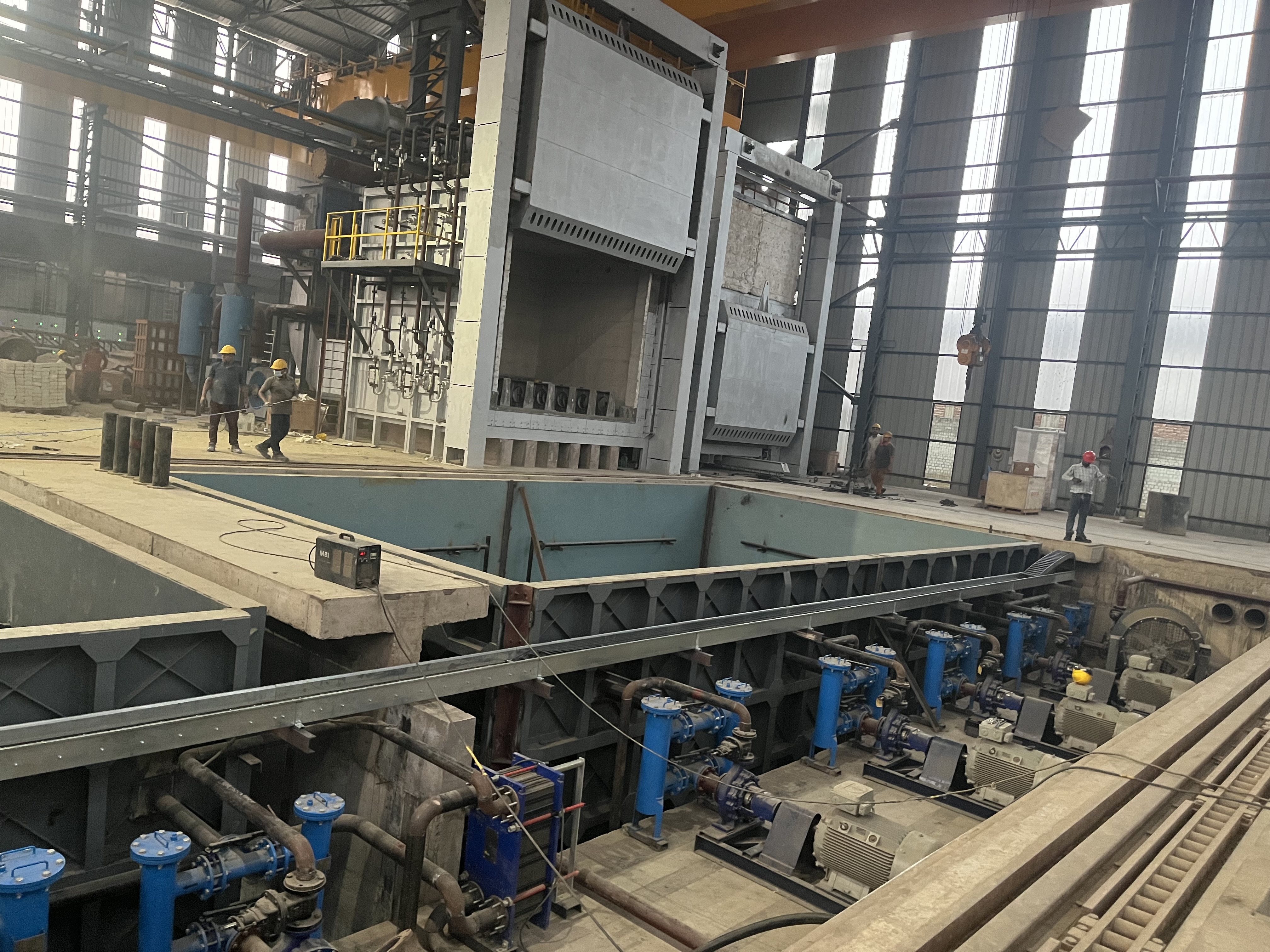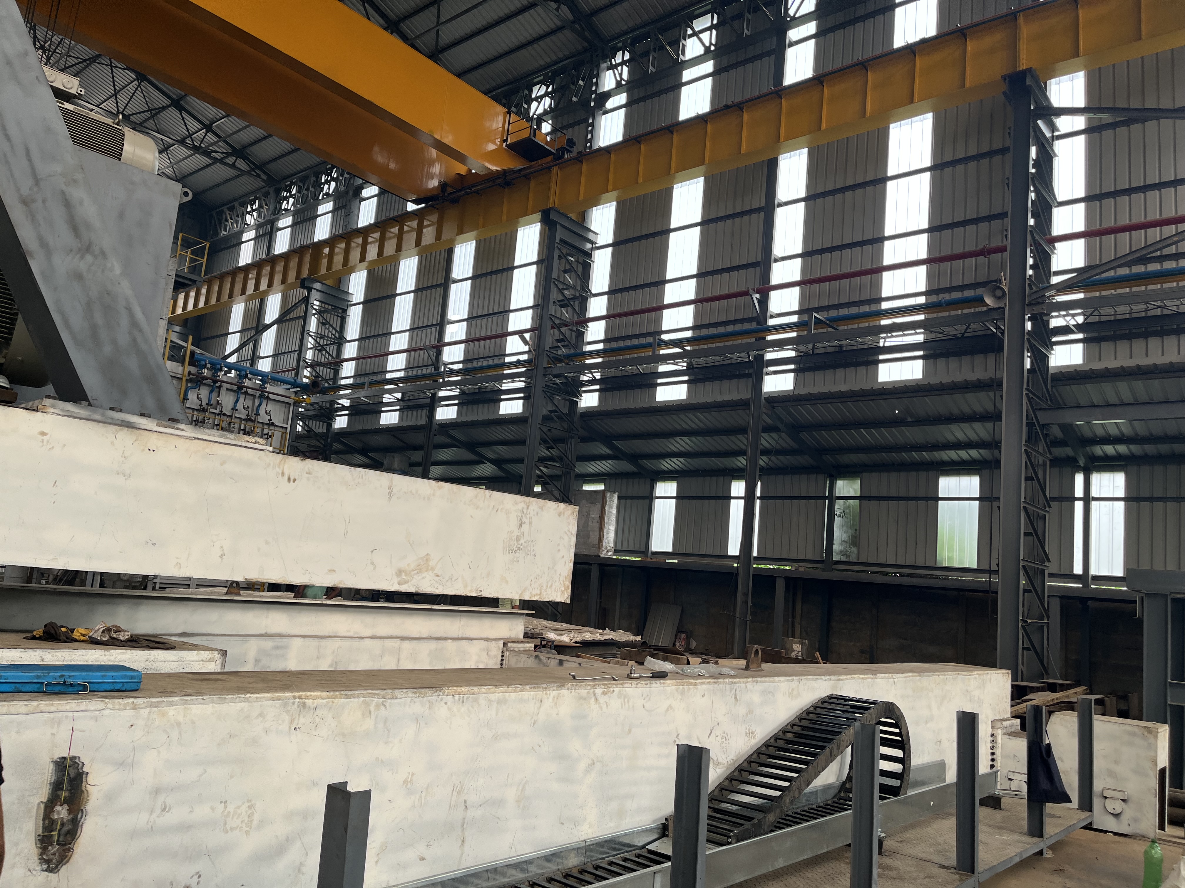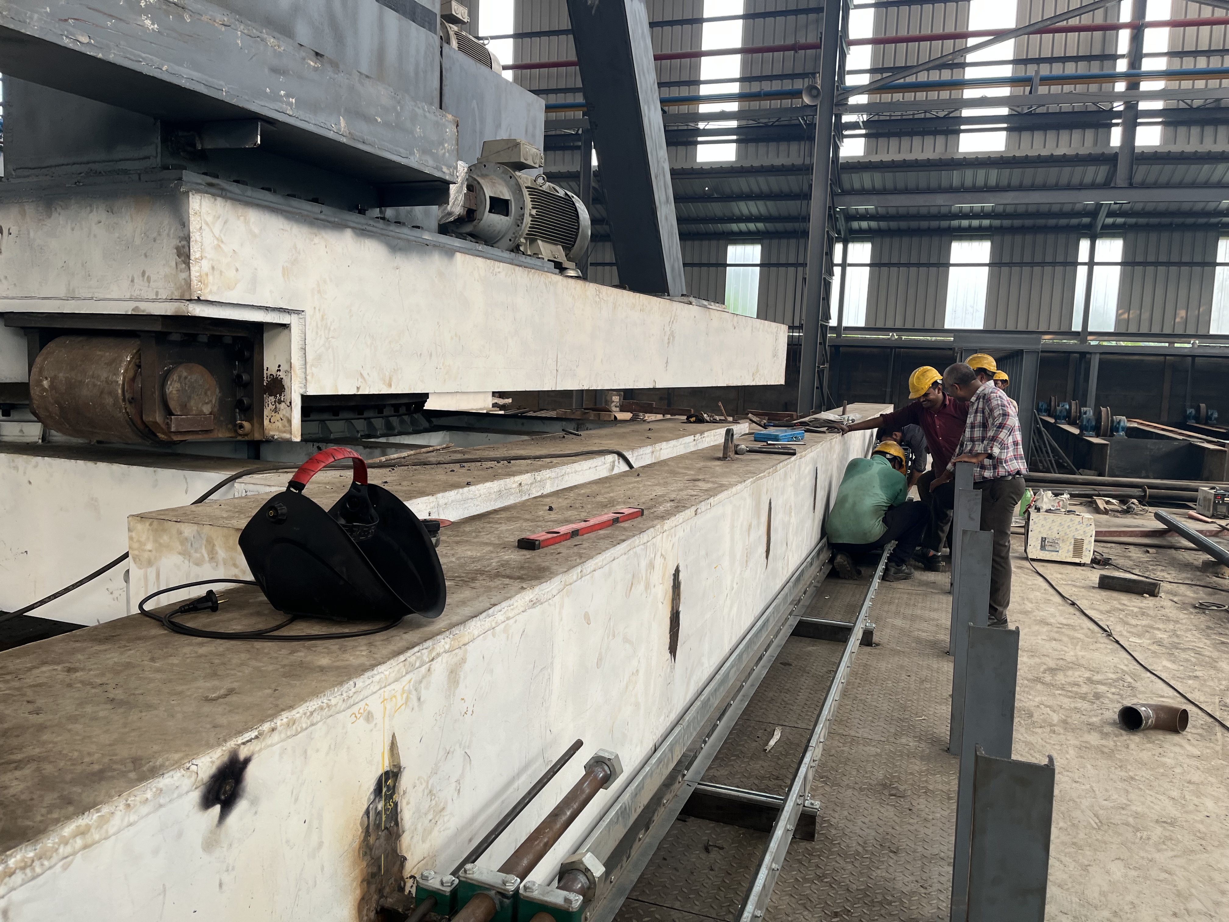 Anwendung: Abdeckungsheber Spannweite – 110 m Gegenläufige Bewegung – Zwei Laufkatzen in einer einzigen Halle Der Abdeckungsheber wird in einer Materialtransportvorrichtung eingesetzt, um schwere Öfen, Ofenabdeckungen, Deckel von Wärmebehandlungskammern, Topfdeckel oder ähnliche schwere Abdeckungen während Wartungsarbeiten oder Produktionsumstellungen sicher und effizient anzuheben und zu entfernen. Diese Lifter können hydraulische, mechanische oder kranmontierte Vorrichtungen sein, die speziell für den industriellen Einsatz entwickelt wurden. In unserem Fall handelt es sich um eine kranmontierte Vorrichtung.