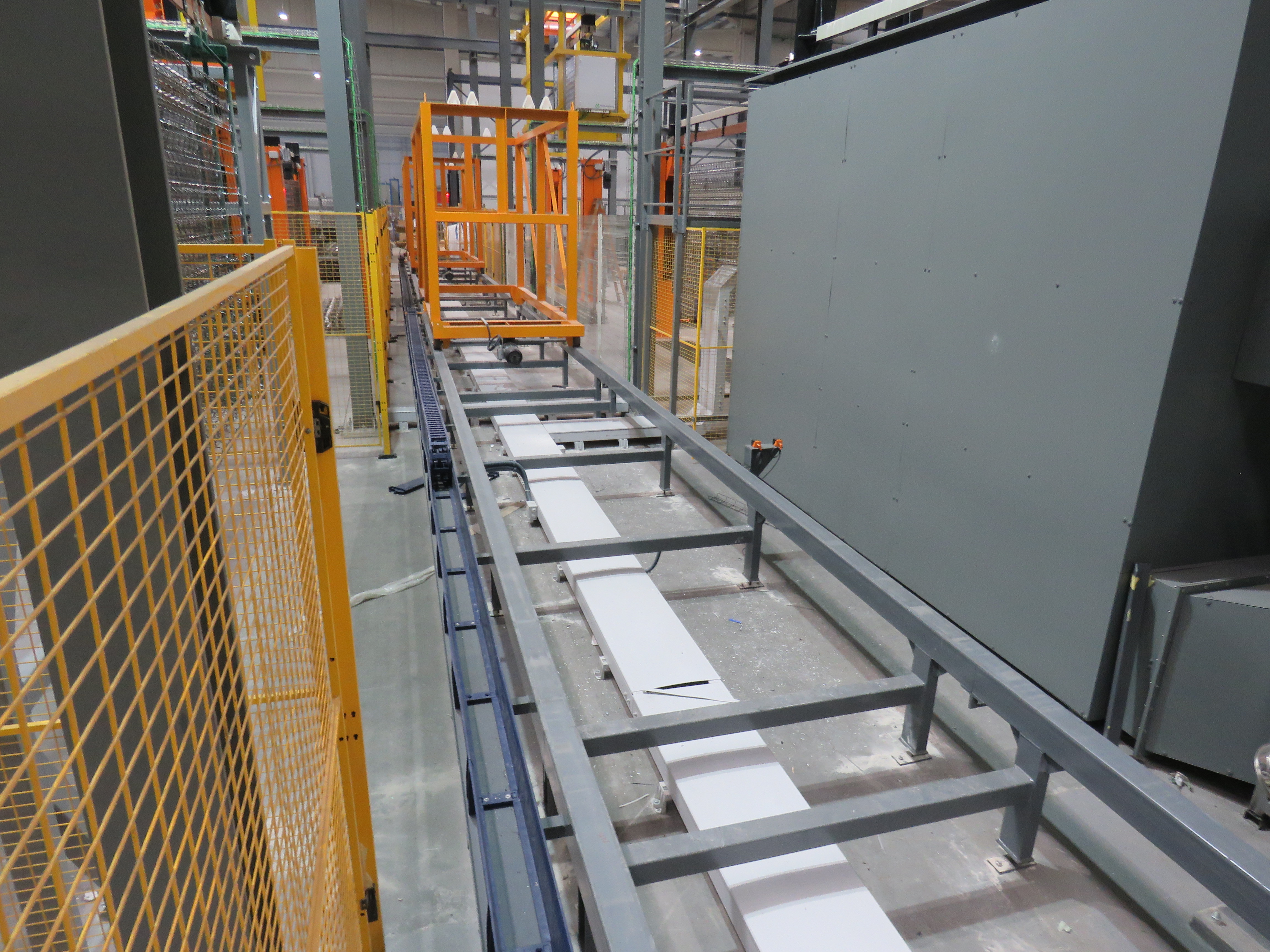 Branche: Industrielle Automatisierung / Spezialmaschinenbau. Einsatzort: Technologische Linie zur Herstellung von großformatigen Mineralgussprodukten (Duschwannen). Die Maschine ist ein Transportglied in einem Bereich mit erhöhter Staubbelastung und transportiert und positioniert Teile zwischen den Prozessen des Aushärtens und Schleifens.