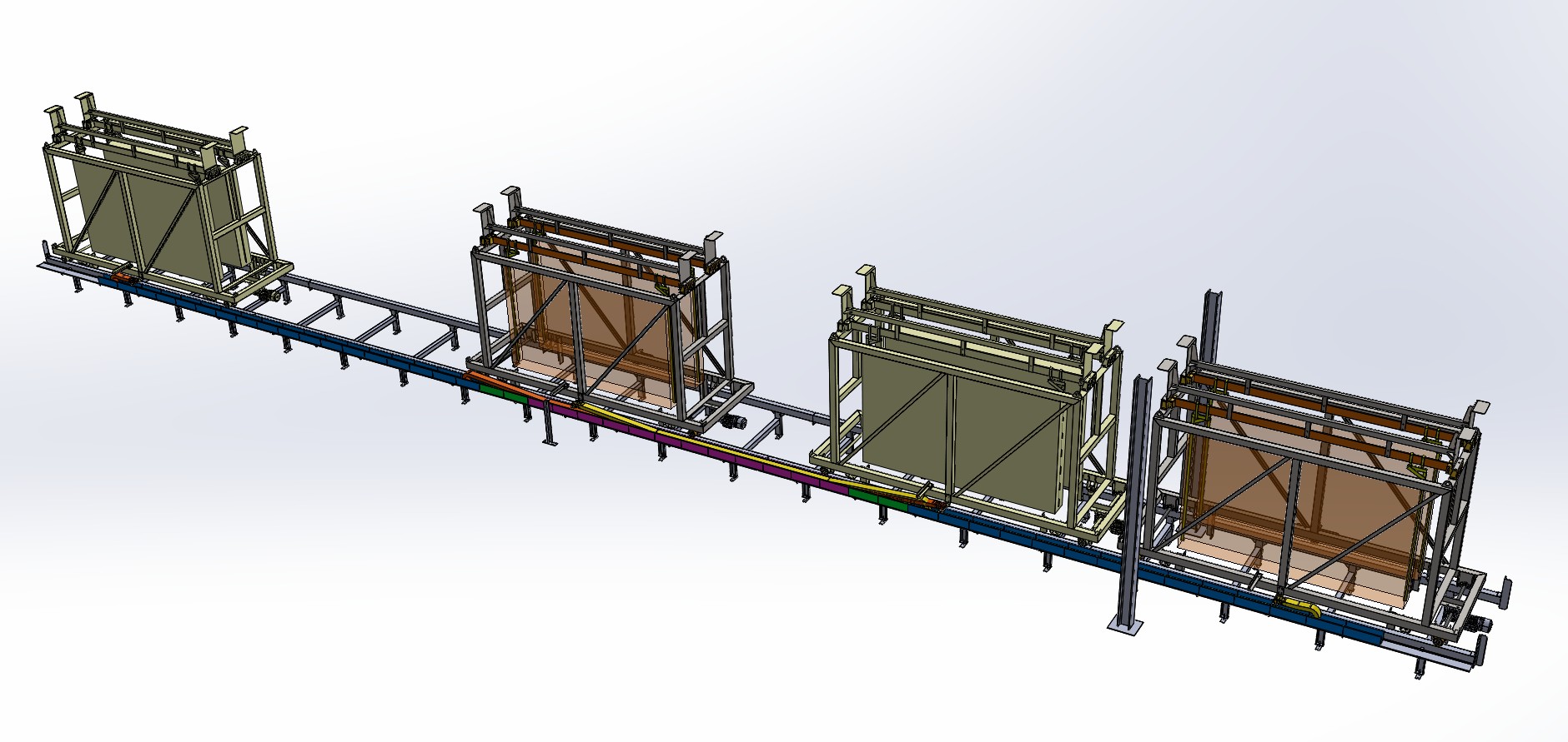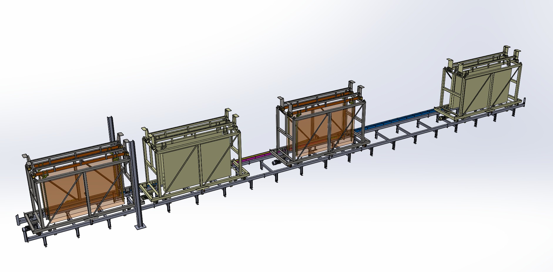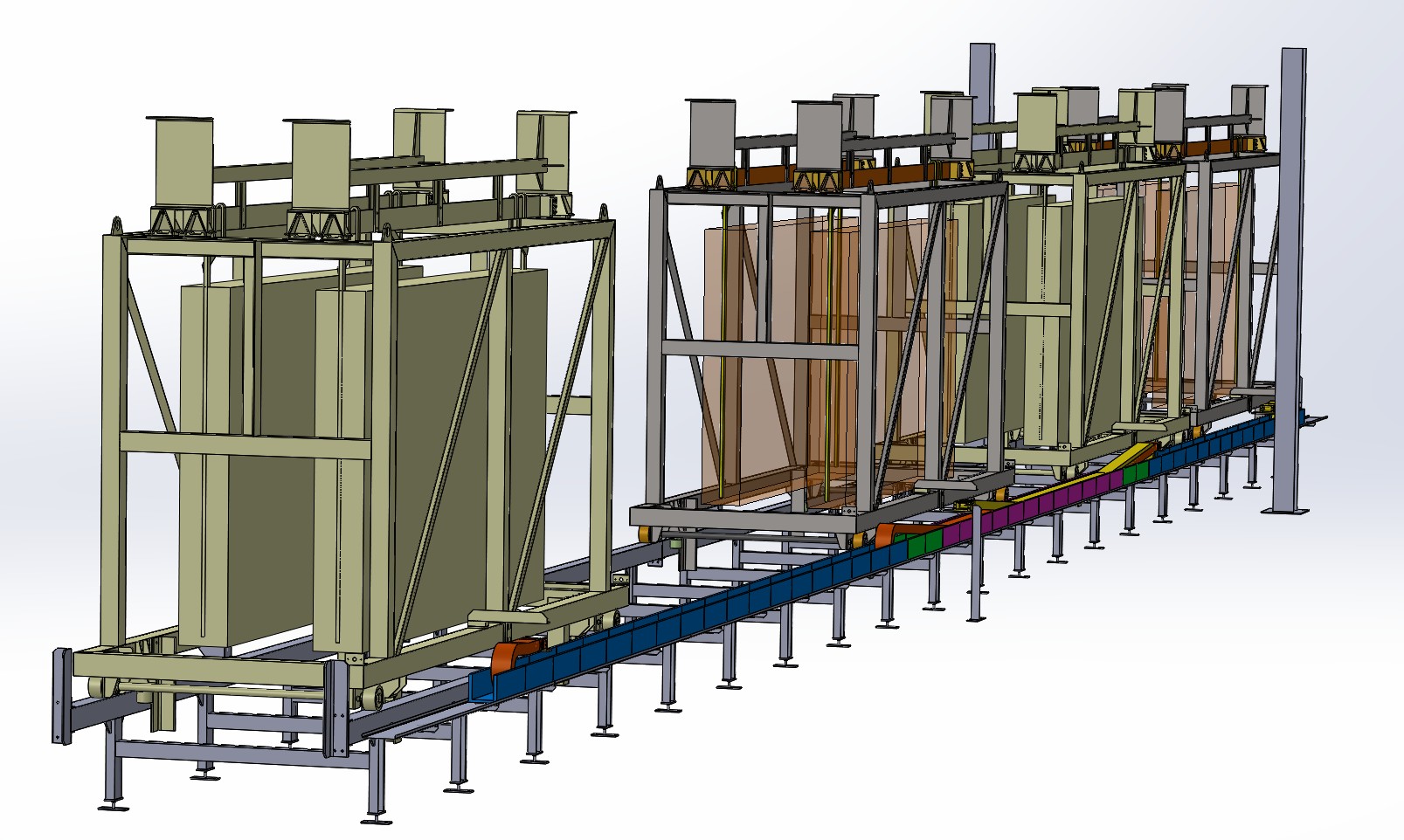 Die Funktion des Systems wäre der Transfer einer doppelt gerahmten Verzinkungslinie zur Beschickung von 4 Be- und Entladestationen. Es wären 2 gegenüberliegende Ketten, Gleitketten mit einer Gesamtlänge von ca. 27 m.