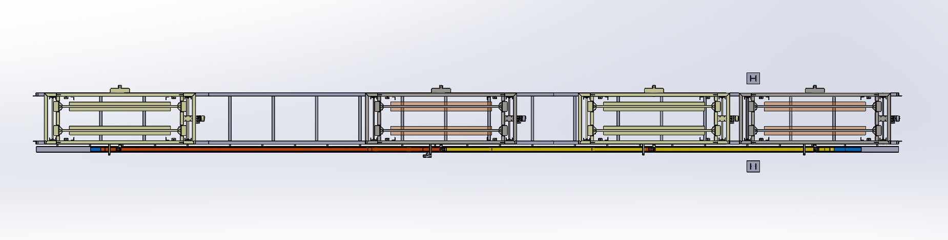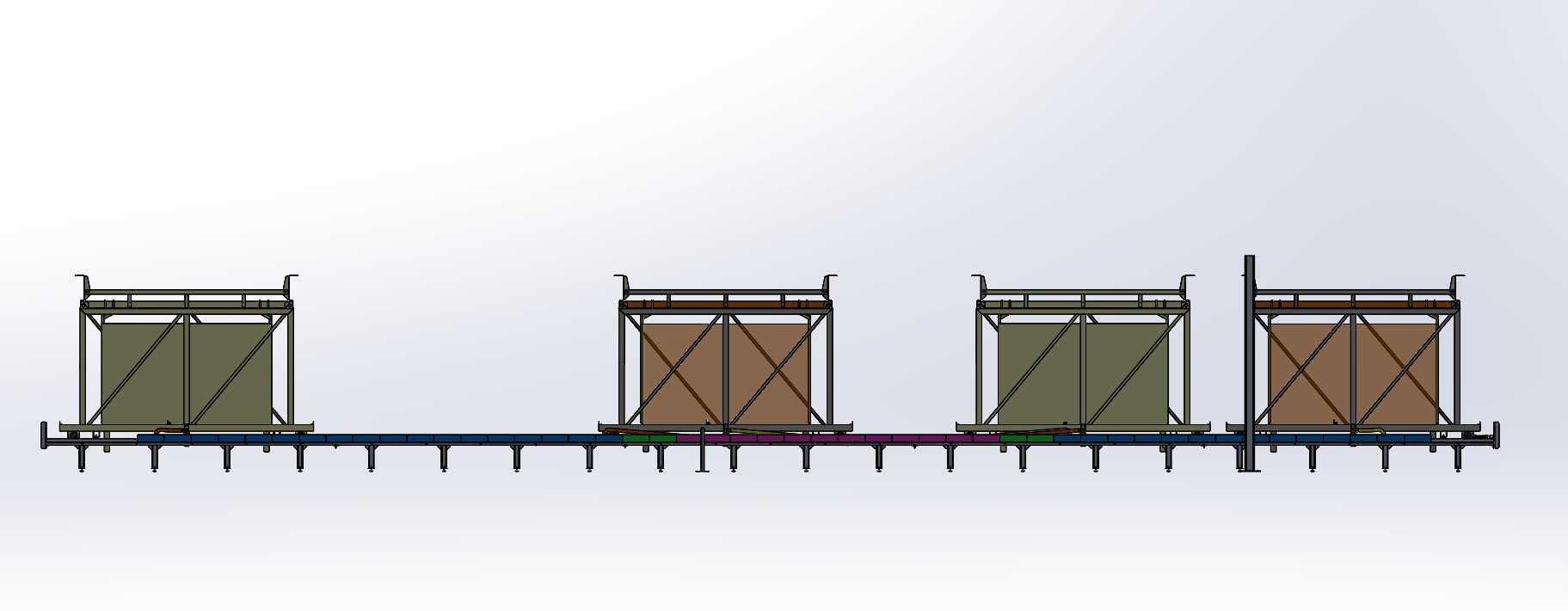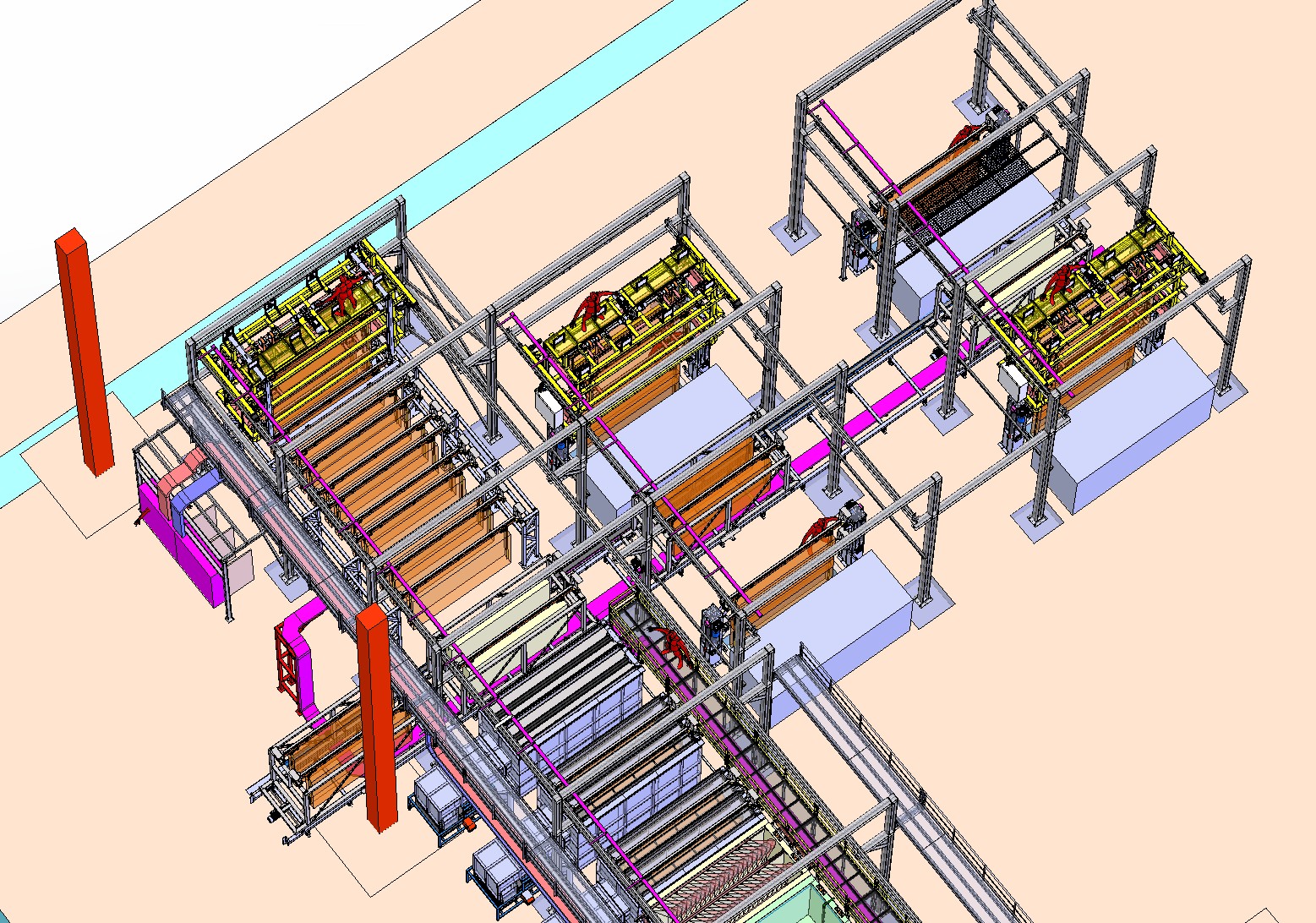 Die Funktion des Systems wäre der Transfer einer doppelt gerahmten Verzinkungslinie zur Beschickung von 4 Be- und Entladestationen. Es wären 2 gegenüberliegende Ketten, Gleitketten mit einer Gesamtlänge von ca. 27 m.