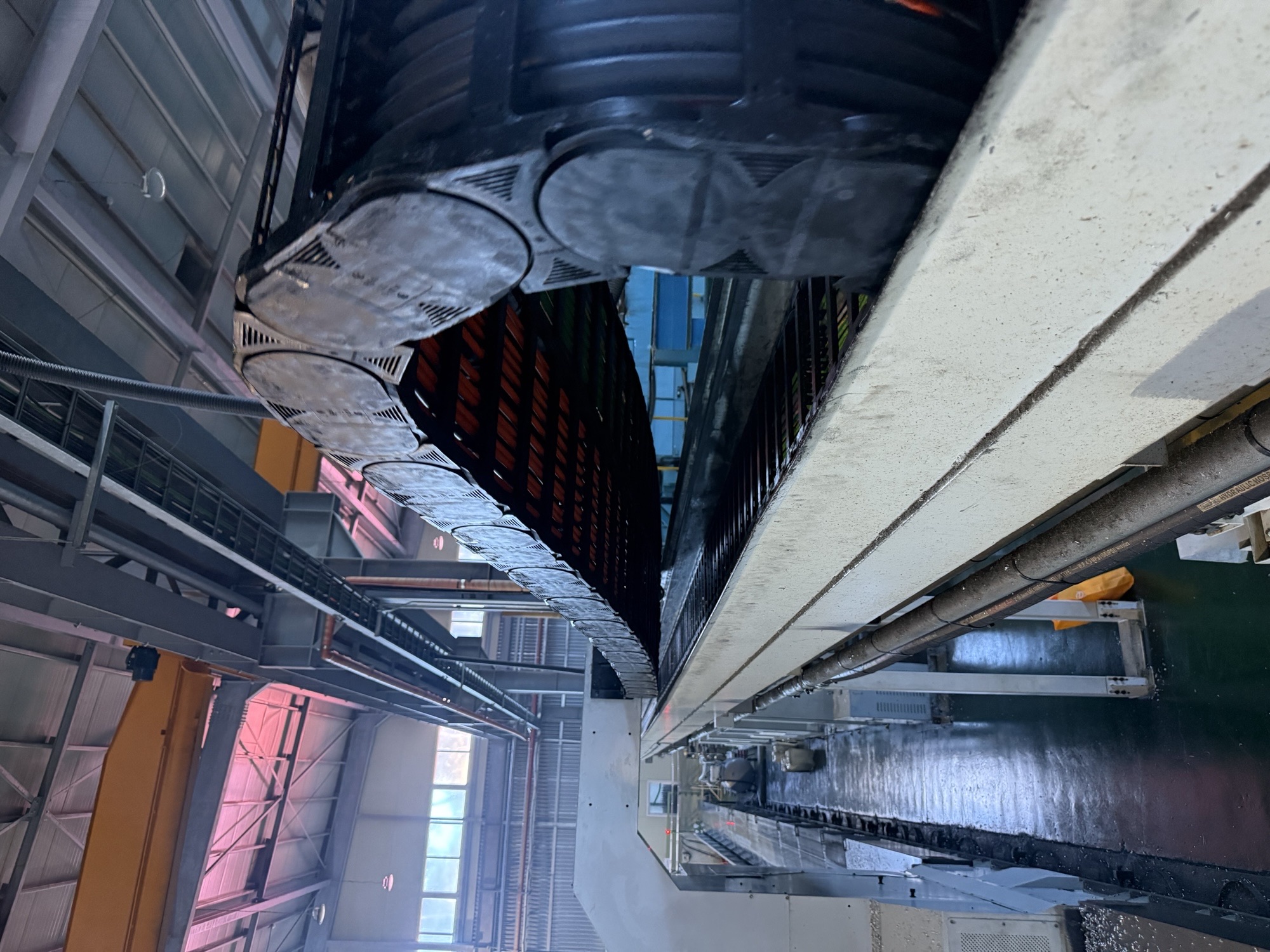 Obwohl es oben installiert ist, wurde das Kabel im Inneren des flexiblen Schlauchs installiert, wodurch die Gesamtbelastung erhöht wurde, und beim Antrieb kam es häufig zu Verwindungen im Inneren der Kette. Es wurde sichergestellt, dass sich das flexible Rohr an einer Stelle befindet, an der keine Späne aufspringen können, und da die Breite mehr als 600 beträgt, wurde eine Mittelstreifen-Kette ausgewählt, um die Belastung auf die Querstange zu verteilen.