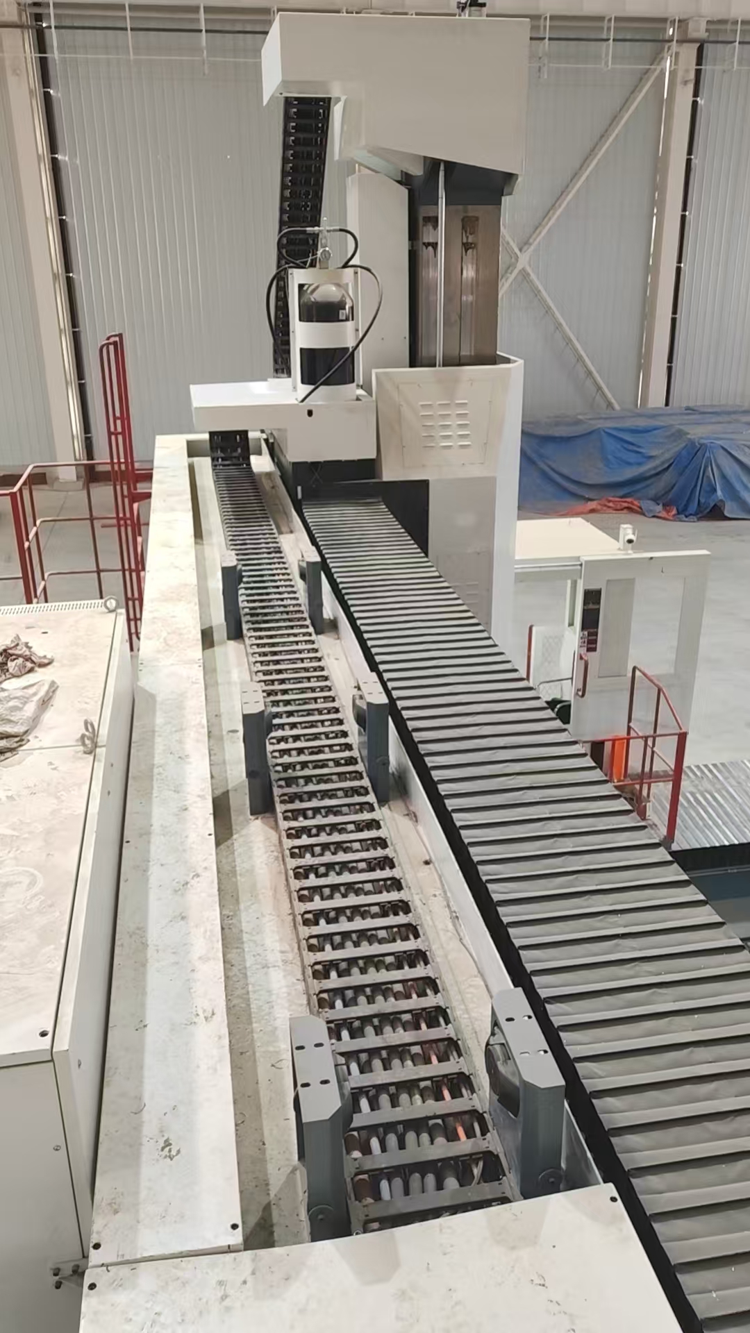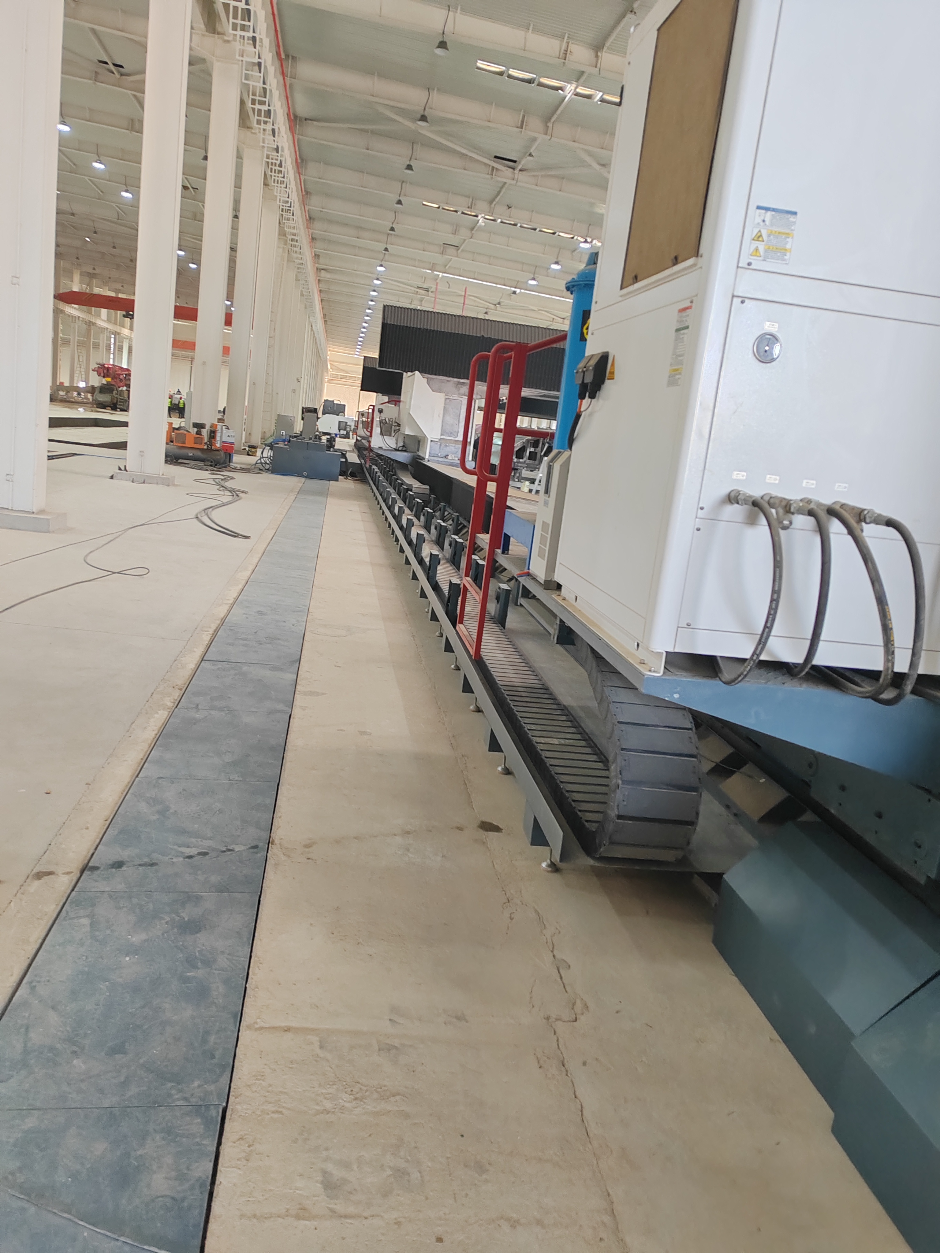 Fünf-Achsen-Portal-Bearbeitungszentrum, mit Siemens-Steuerung, in der Luft-und Raumfahrt und Luftfahrt wichtige Ausrüstung für die groß angelegte Verarbeitung von Schlüsselkomponenten, das Projekt gilt das Portal Bearbeitungszentrum vollen Hub 64 * 9, ist die längste Hub-Portal-Bearbeitungszentrum in China, mobile Stromversorgung Regelung mit Igus guidelok langen Hub Schleppkette System, um den stabilen Betrieb der Werkzeugmaschine.
