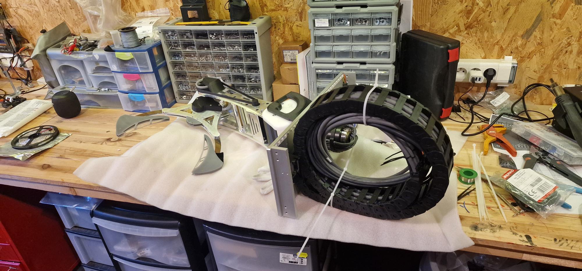 J’ai envisagé plusieurs options : Boucles libres avec gaine tressée / guide-câble : simple, mais fatigue des câbles et rendu visuel moins qualitatif. -Spirales/enrouleurs : risque de torsion, contraintes mécaniques variables, moins adapté aux mouvements complexes. -Chaînes d’autres fournisseurs : comparées sur encombrement/esthétique, disponibilité et modularité. -Cheminement interne rigide (goulottes + marge) : moins fiable, moins "propre", et moins tolérant aux évolutions. La solution igus était la plus cohérente pour concilier fiabilité + intégration + évolutivité.
