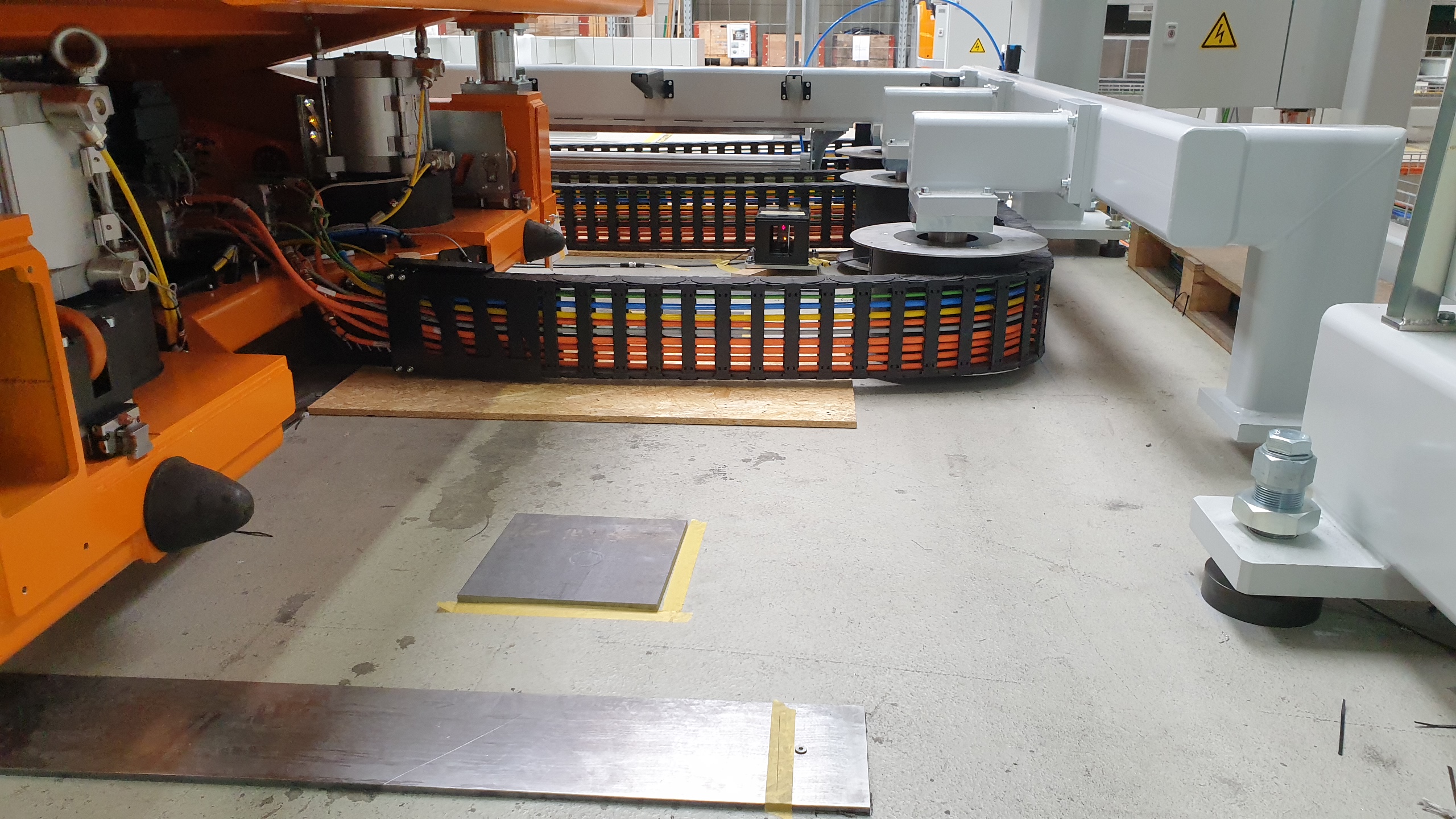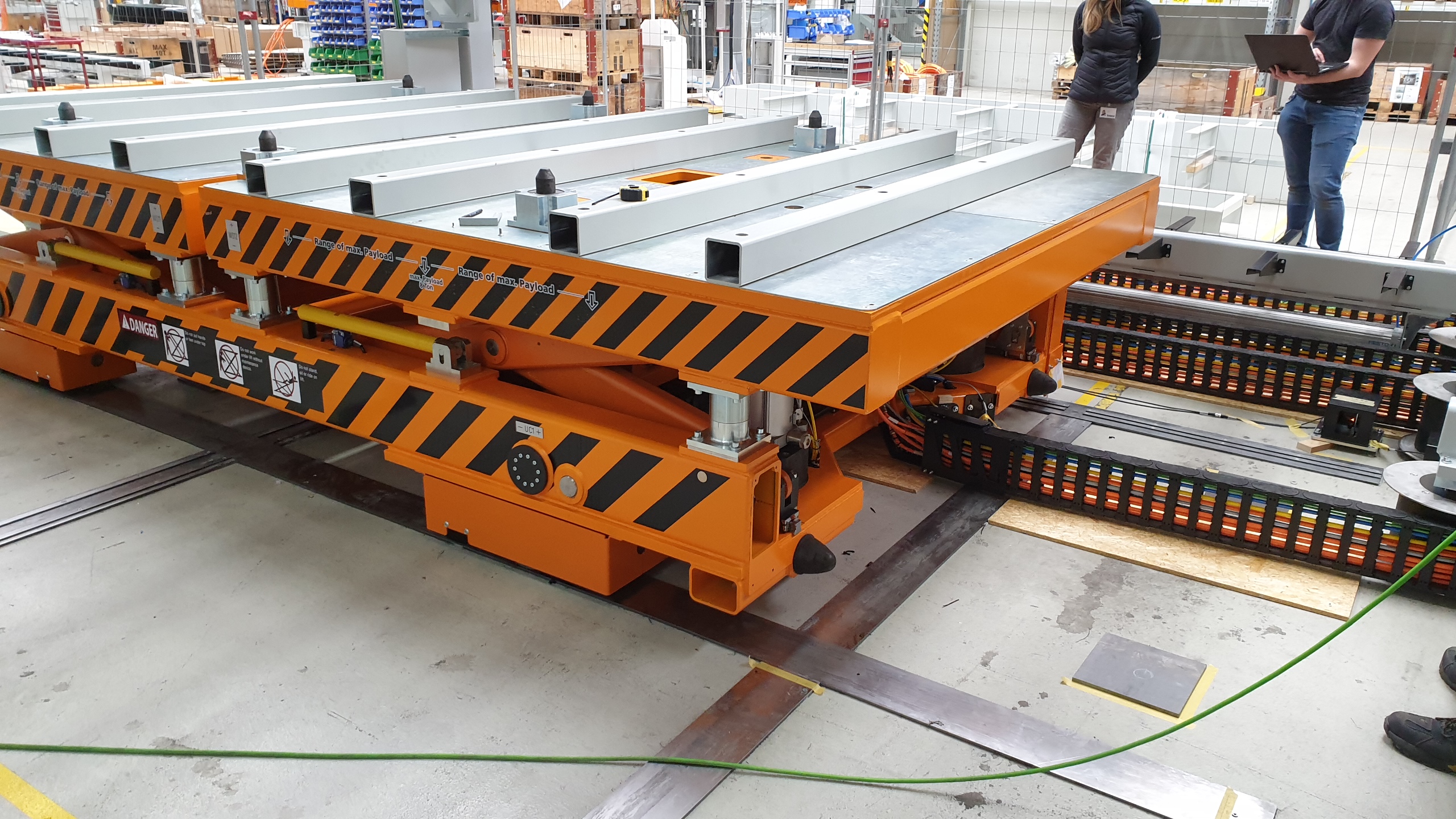 Die Anlage, ein Schwerlast-Scherenhubtisch, wird verwendet, um Rohblechstapel in einem automatisierten Zuführungsprozess an die Pressenlinie zu liefern. Eine zentrale technische Herausforderung bestand in der Konstruktion und Integration eines Energieversorgungssystems, das lange Verfahrwege und mehrachsige Bewegungen auf extrem begrenztem Bauraum bewältigen und gleichzeitig eine hohe Betriebssicherheit gewährleisten kann. Erreicht wurde dies durch eine mehrstufige, mechanisch gelenkte Energieführungskette mit automatischem Rückzugsystem. Die Lösung ermöglicht ein kontrolliertes Kabel- und Schlauchmanagement, hält definierte Biegeradien ein und gewährleistet eine gleichmäßige Energieführung über den gesamten Bewegungsbereich.