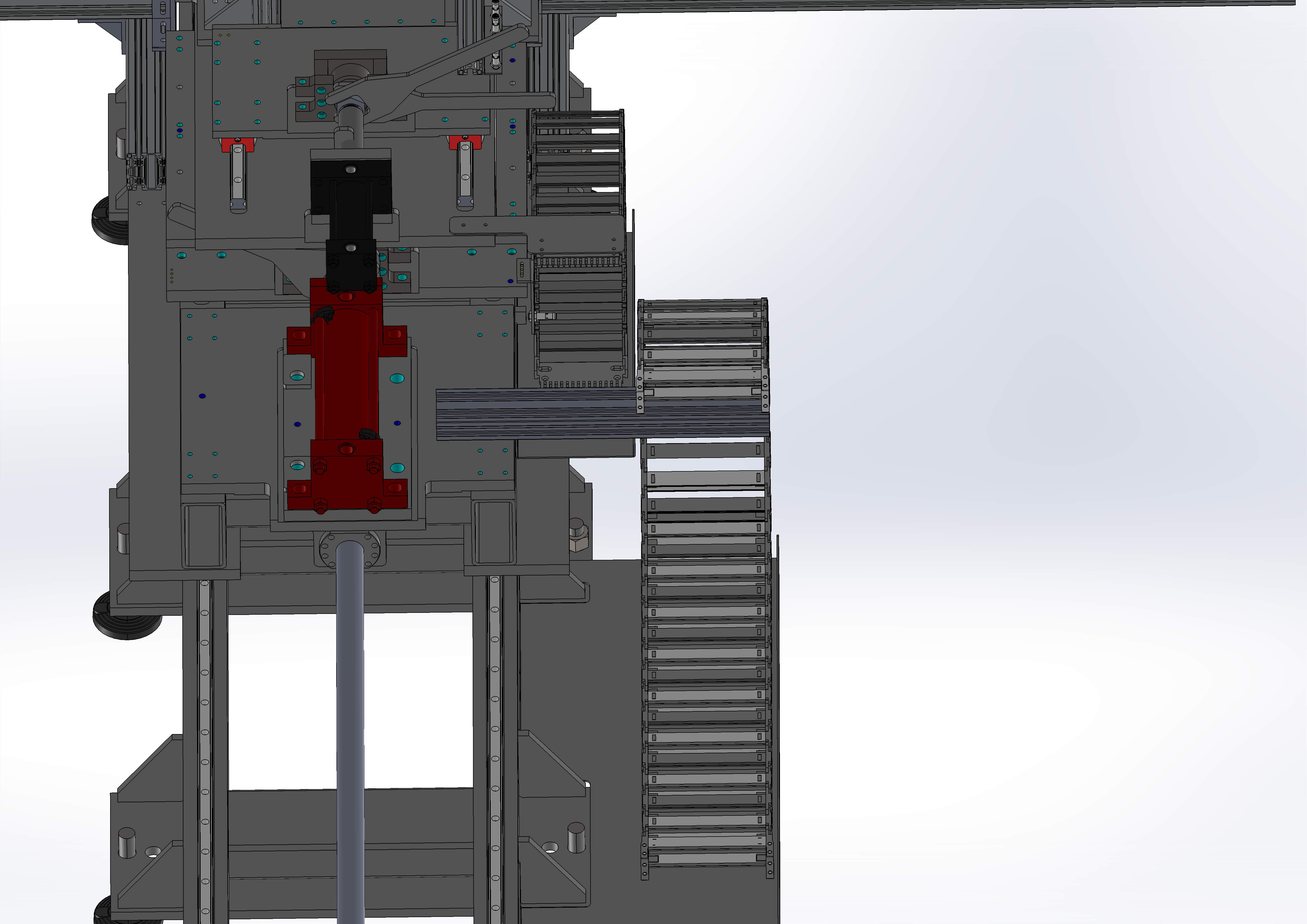 Das Hauptproblem bestand darin, die Höhe kompakt zu halten und gleichzeitig den Biegeradius der Kabel zu gewährleisten. Außerdem haben wir versucht, die Abmessungen aller Stützkomponenten der Kette zu reduzieren. Durch die schräge Anordnung der Kette zur Vertikalen konnten wir direkt in den Anschlussbereich gelangen, ohne zusätzliche Kanäle vorsehen zu müssen.