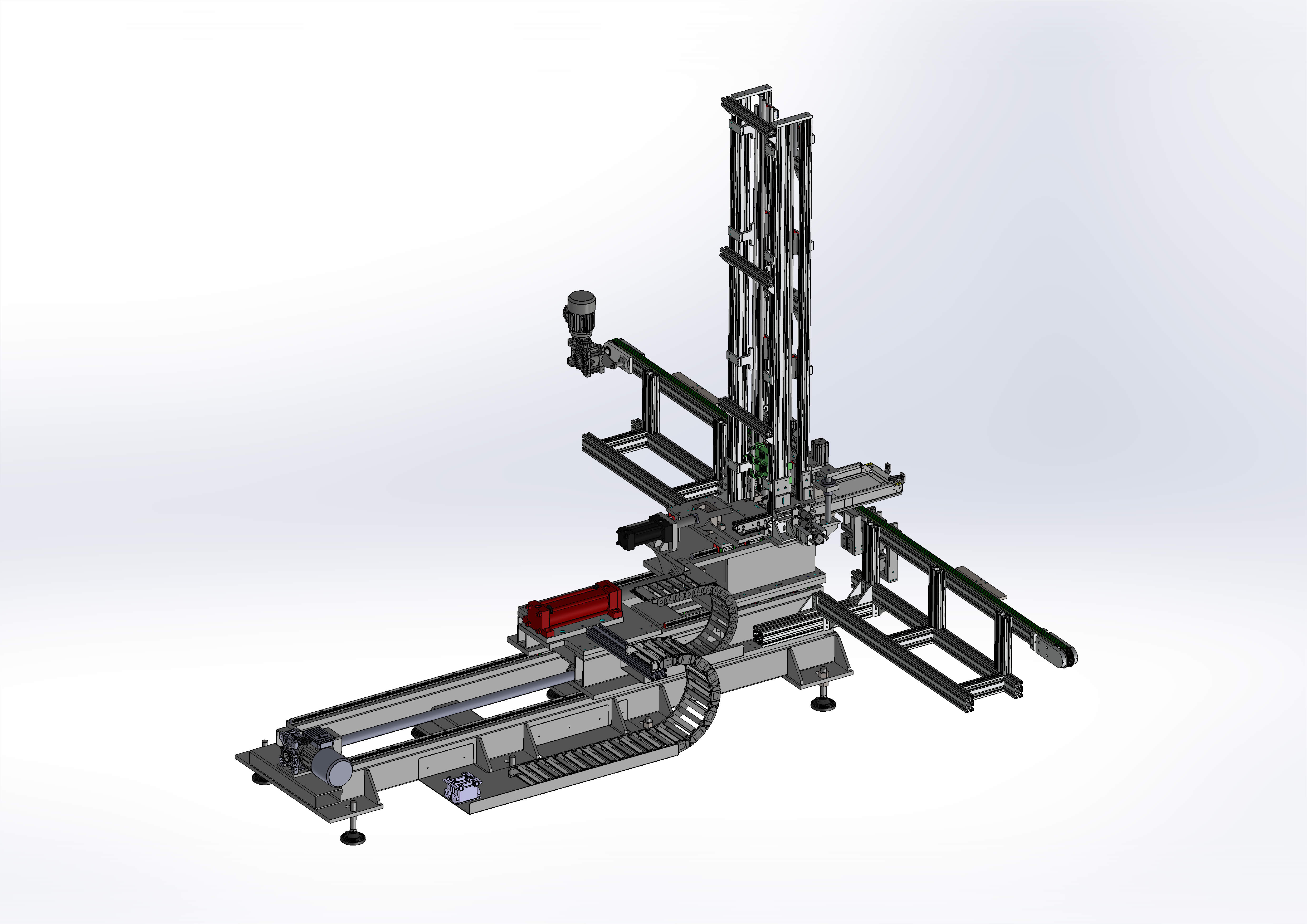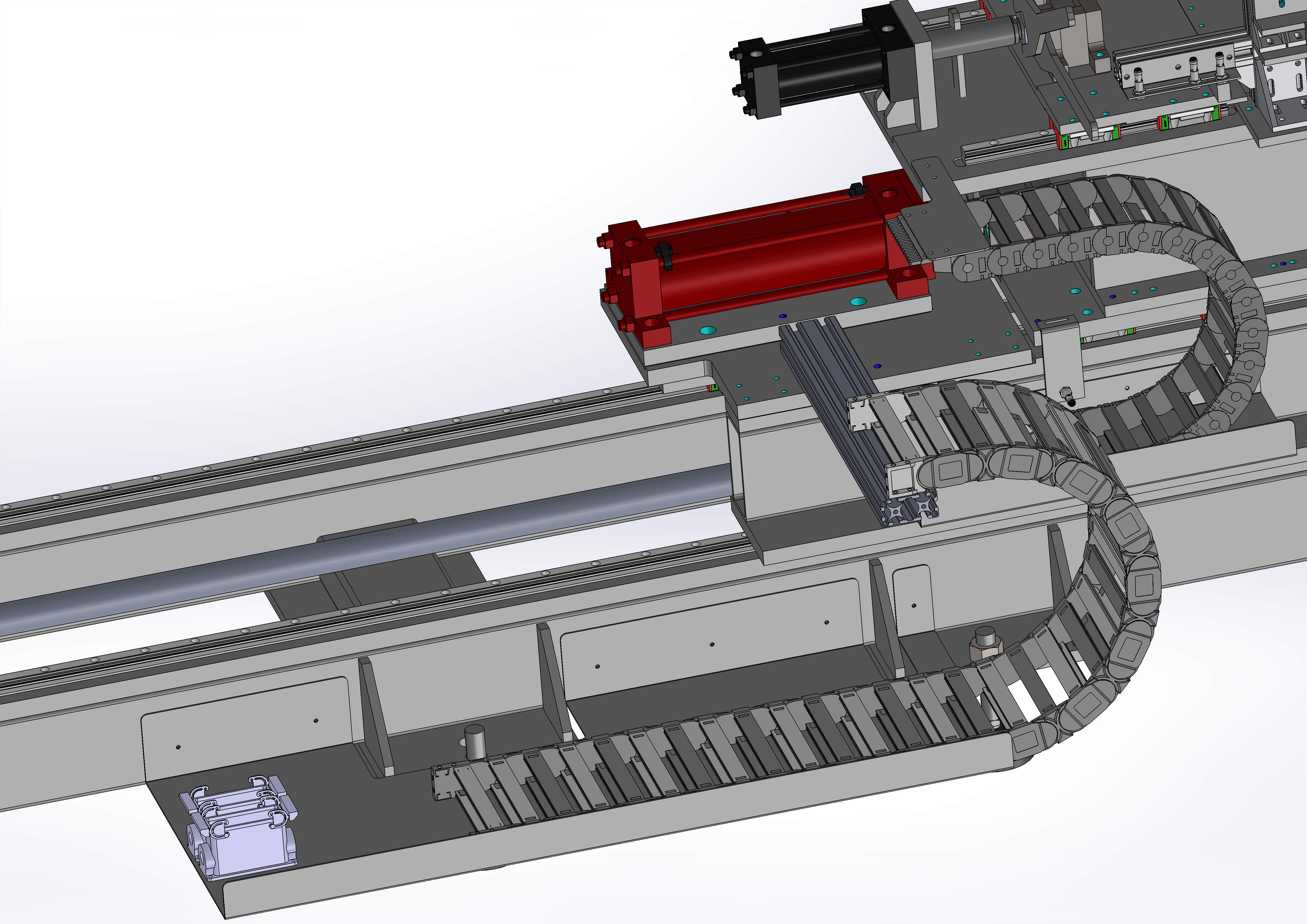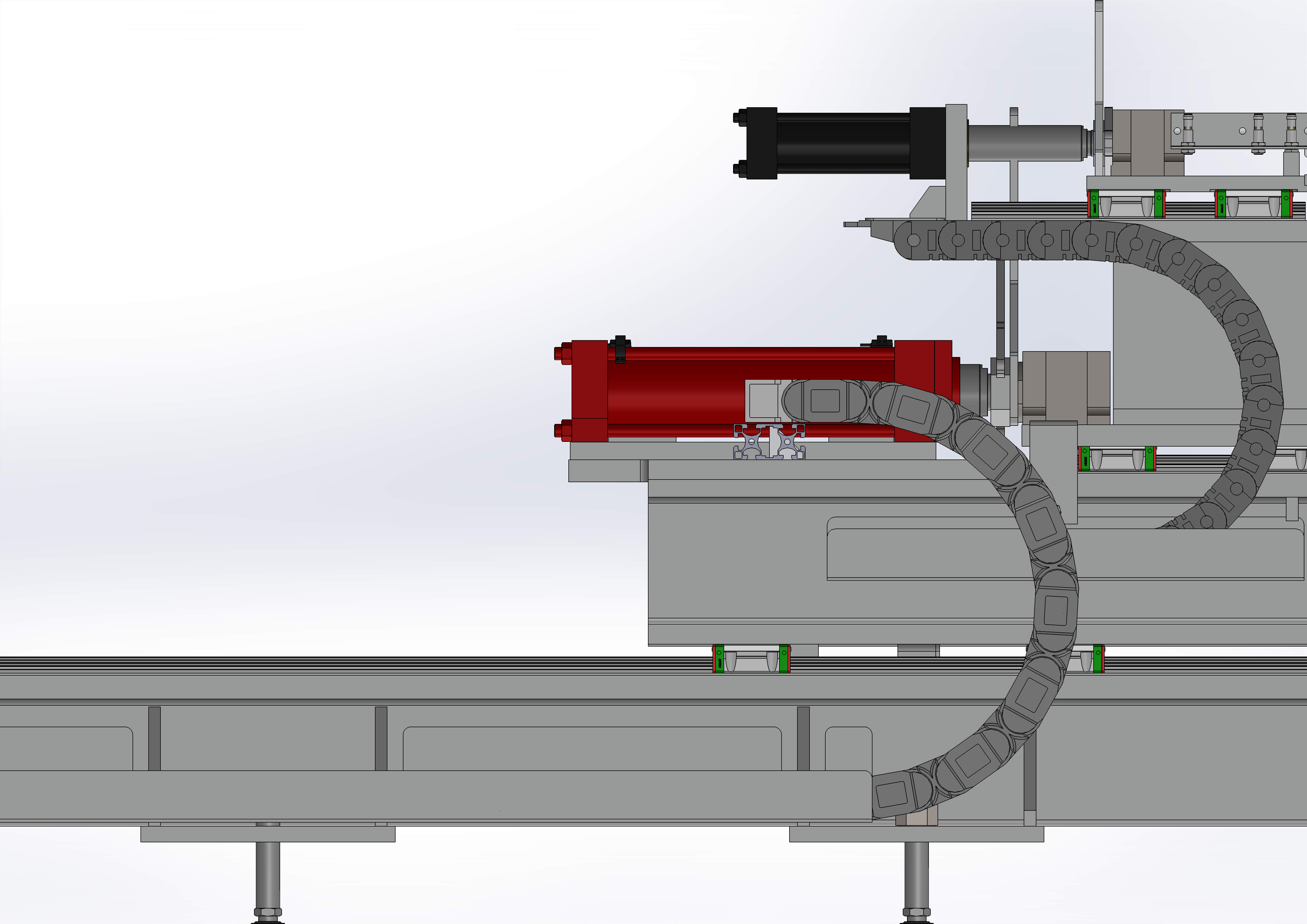 Automatische Endkappen-Montagemaschine für Metallgerüstbohlen Dieses spezialisierte automatisierte System wurde für das schnelle Anbringen von Endkappen (Köpfen) an Metallgerüstbohlen entwickelt. Die Kernarchitektur der Maschine basiert auf einem 3-achsigen überlagerten linearen Bewegungssystem, bei dem jede Achse hydraulisch betätigt wird, um die für eine präzise Positionierung und eine hochbelastbare Presspassung erforderliche hohe Kraftdichte zu erzielen. Hydraulische kinematische Konfiguration Der mechanische Aufbau umfasst drei ineinander verschachtelte Linearachsen, die von hochpräzisen Hydraulikzylindern angetrieben werden. Diese Achsen arbeiten in einer koordinierten Abfolge, um die Endkappe an das Profil der Platte anzupassen. Die Wahl der Hydraulikleistung gewährleistet maximale strukturelle Steifigkeit und den erforderlichen Schub, um den mechanischen Widerstand der Metallkomponenten während der Montage zu überwinden. Fortschrittliches Kabelmanagement: IGUS E-Chain® Serie 2600 Angesichts der beträchtlichen Hublänge von zwei dieser Achsen und der Komplexität der Hydraulikkreisläufe verfügt die Maschine über leistungsstarke lineare Energieführungen der Serie 2600 von IGUS (Modell 2600.15.200.0). Modulares und robustes Design: Die Serie 2600 verfügt über eine hochfeste Stift-Bohrung-Verbindung, die auch bei überlagerten Bewegungen seitliche Stabilität gewährleistet, selbst wenn sie das Gewicht von unter Druck stehenden Hydraulikschläuchen trägt. Integrität der Hydraulikschläuche: Eine wichtige Konstruktionsvorgabe war die strikte Einhaltung des Mindestbiegeradius der Hydraulikschläuche. Durch die Verwendung eines Radius (R) von 200 mm wird sichergestellt, dass die Schläuche innerhalb ihrer Elastizitätsgrenze betrieben werden, wodurch Knicken, Druckabfälle oder ermüdungsbedingte Ausfälle verhindert werden. Wartungseffizienz: Die Querstangen sind sowohl entlang des Innen- als auch des Außenradius abnehmbar, sodass eine schnelle Inspektion oder ein schneller Austausch der Hydraulikleitungen möglich ist, ohne die gesamte Kette demontieren zu müssen. Technische Highlights Überlagerte hydraulische Präzision: Der 3-Achsen-Stapel ermöglicht eine unabhängige Steuerung von Ausrichtung, Tiefe und Klemmung und nutzt dabei die Kraft der Hydraulik bei kompakter Bauweise. Dynamischer Schutz: